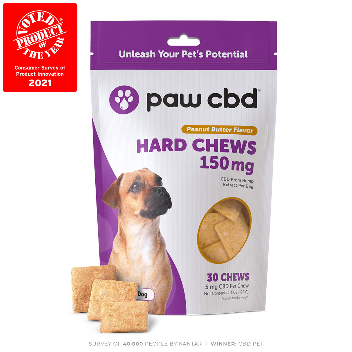 For example, if you have a 150 mg jar of our CBD hip and joint chews for dogs, each of the 30 chews will deliver about 5 mg of CBD. But with the 600 mg jar, each chew will have about 20 mg of CBD. So the strength of the product you’re using will be an important factor in determining how much to give to your pet.